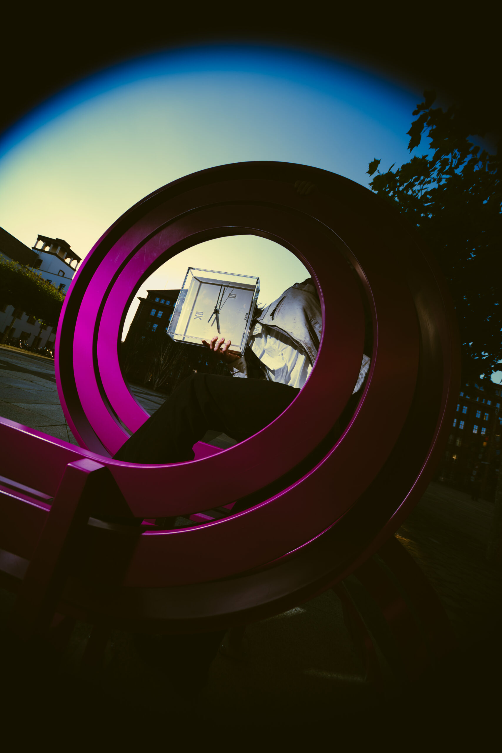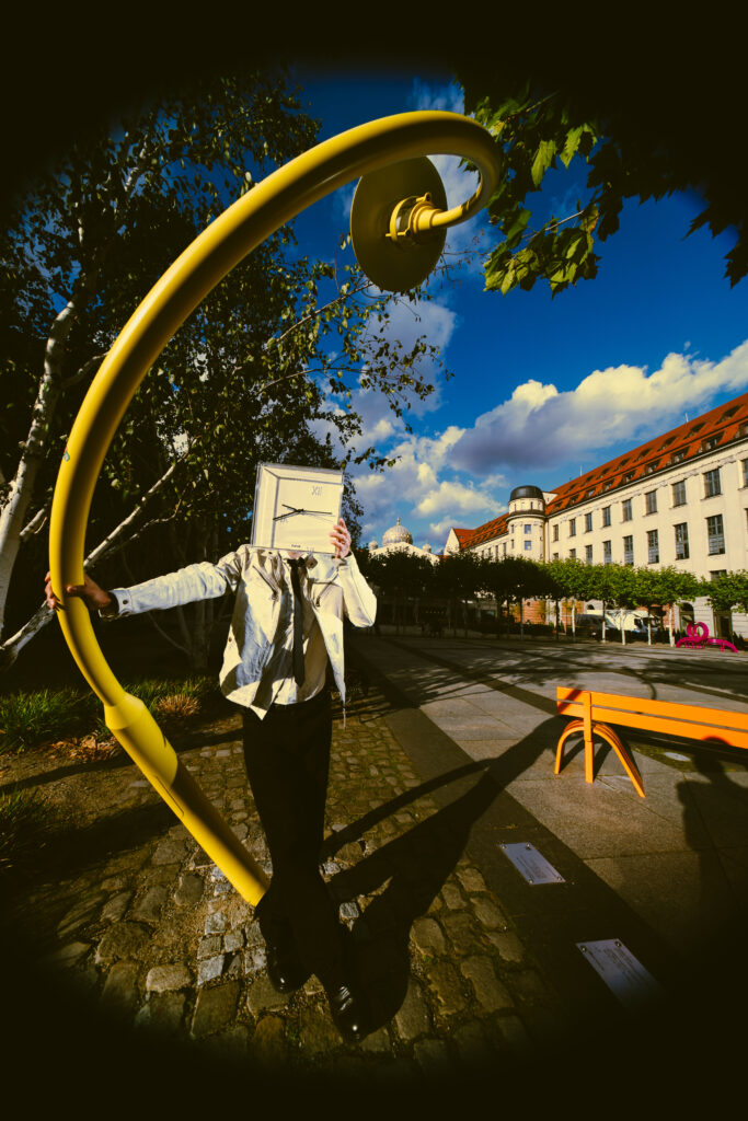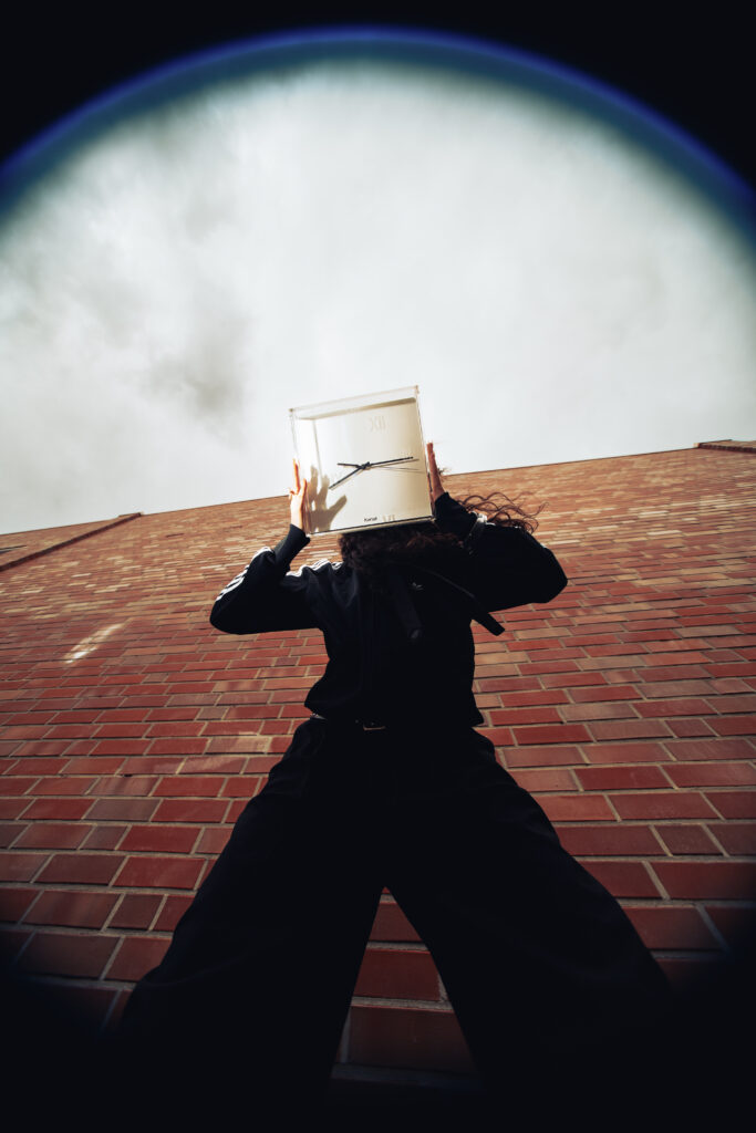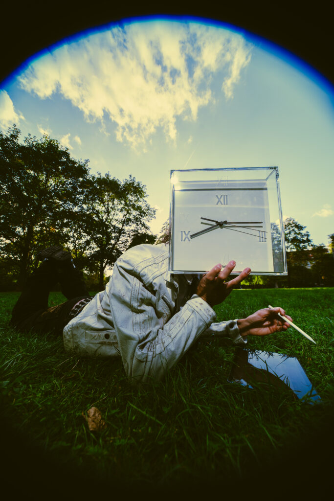 Sie beschreibt Menschen, deren Gesichter von einer Uhr verdeckt werden – nicht, um ihre Identität zu verstecken, sondern um den Blick auf etwas anderes zu lenken: den Moment.
